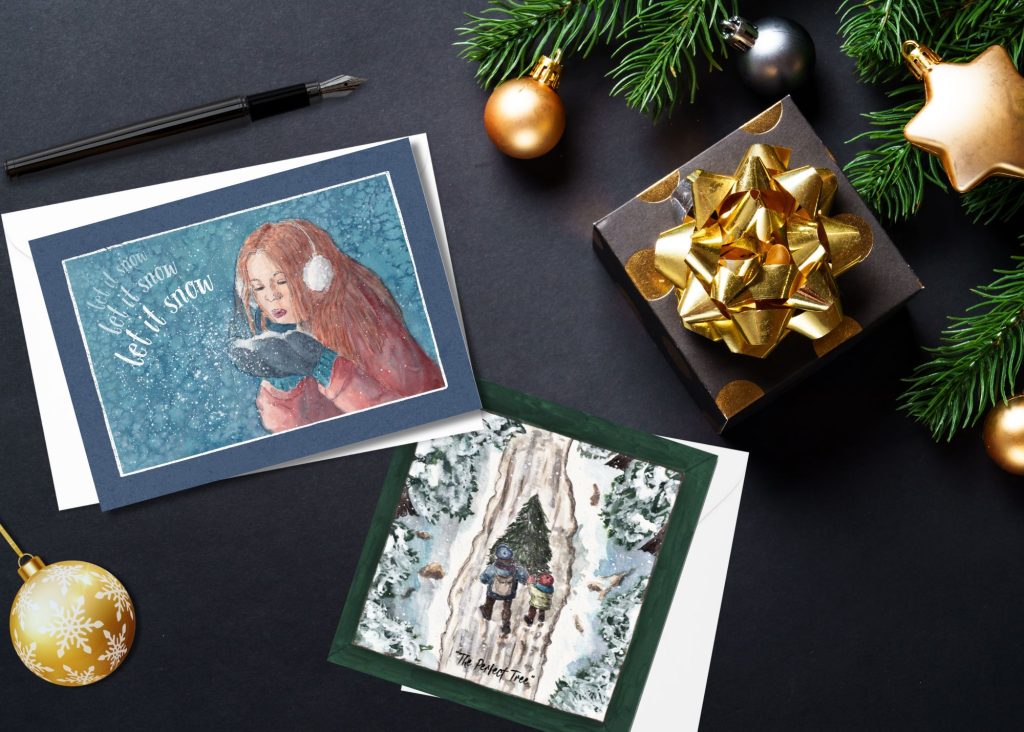 This year, we’re “going out” in a blaze of glory. If you’ve read our recent posts, you’ll know that Willow Lane might be closing soon, but we spent so long on these Christmas cards, from initial planning through to painting and drawing, to designing, that we couldn’t bear the thought of not bringing them out. At the very least, they might bring you Christmassy joy just looking at the images of them on our site, or maybe even inspire your own artworks and Christmas projects.