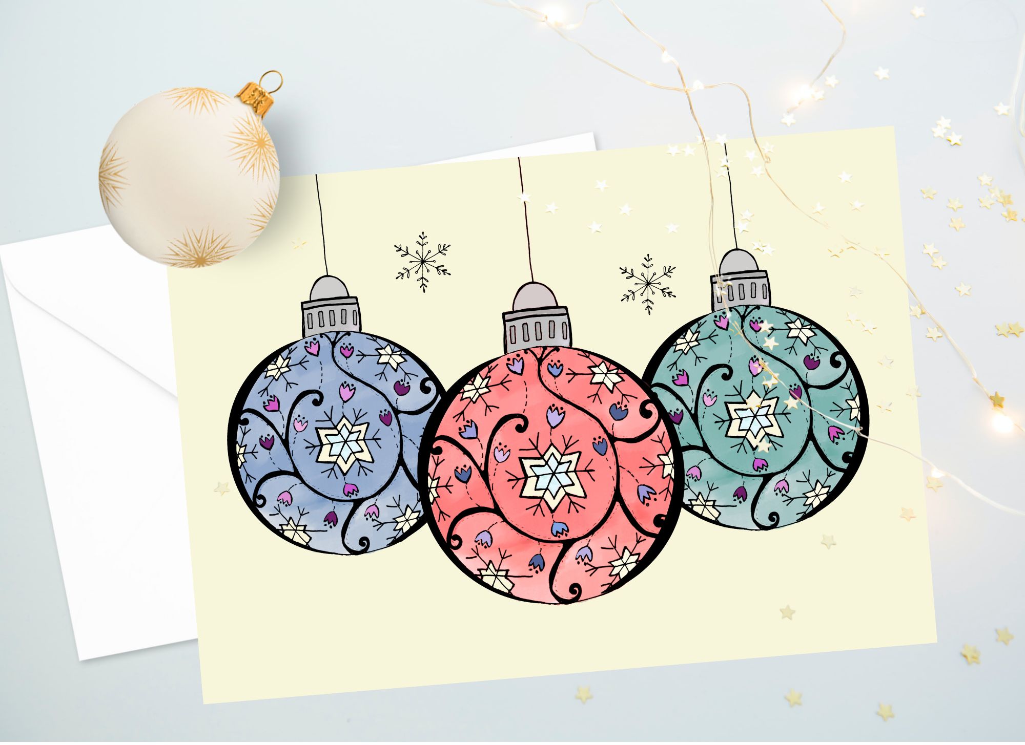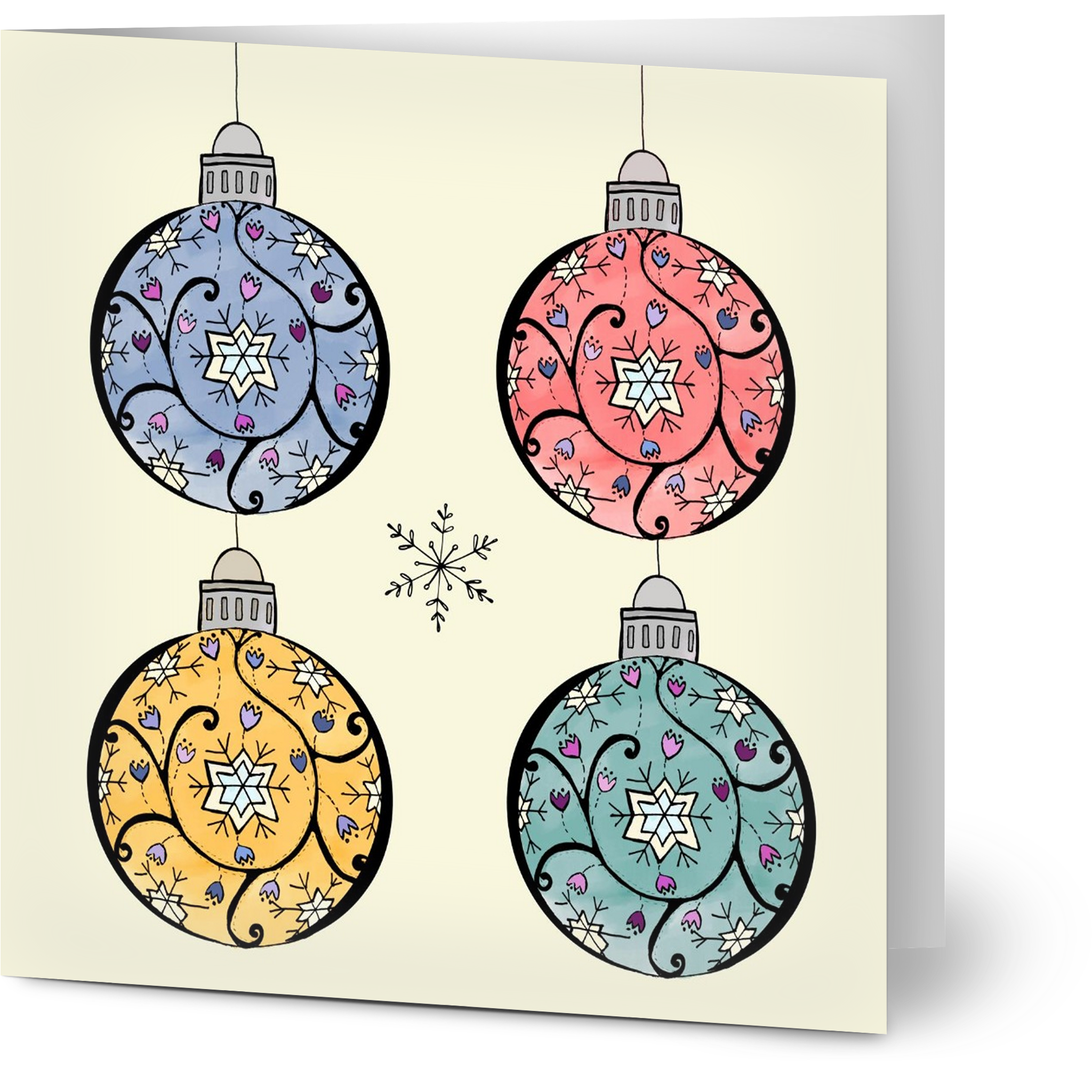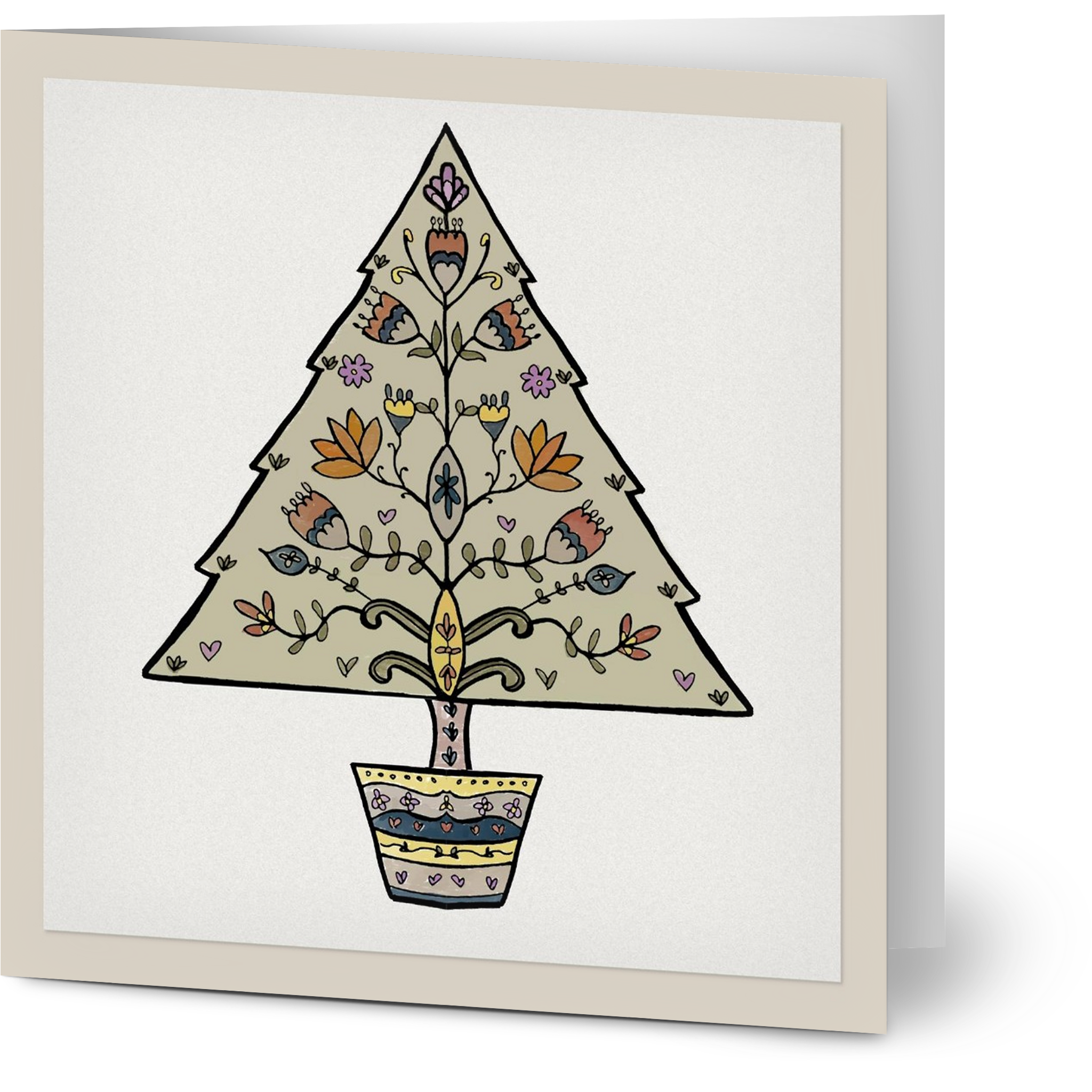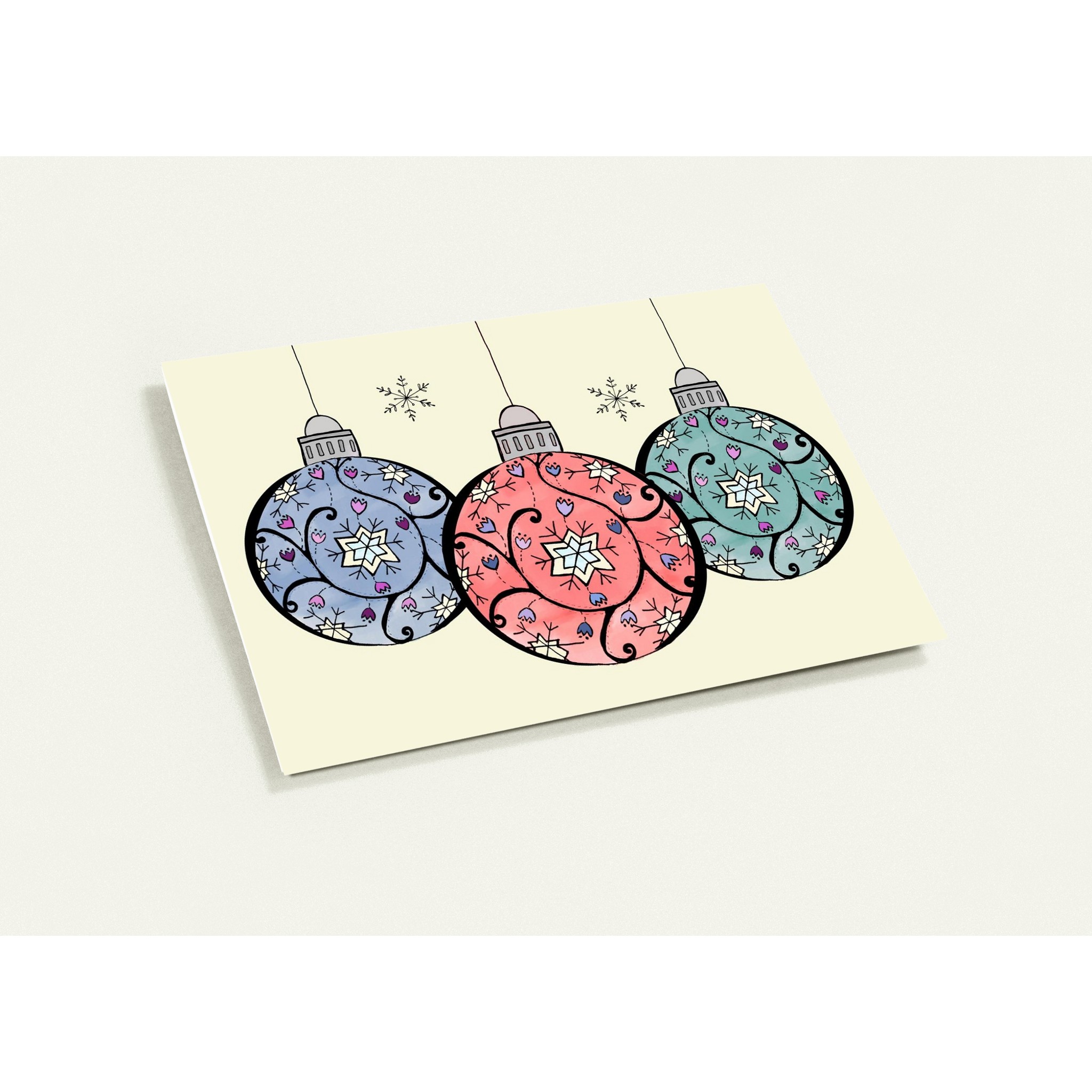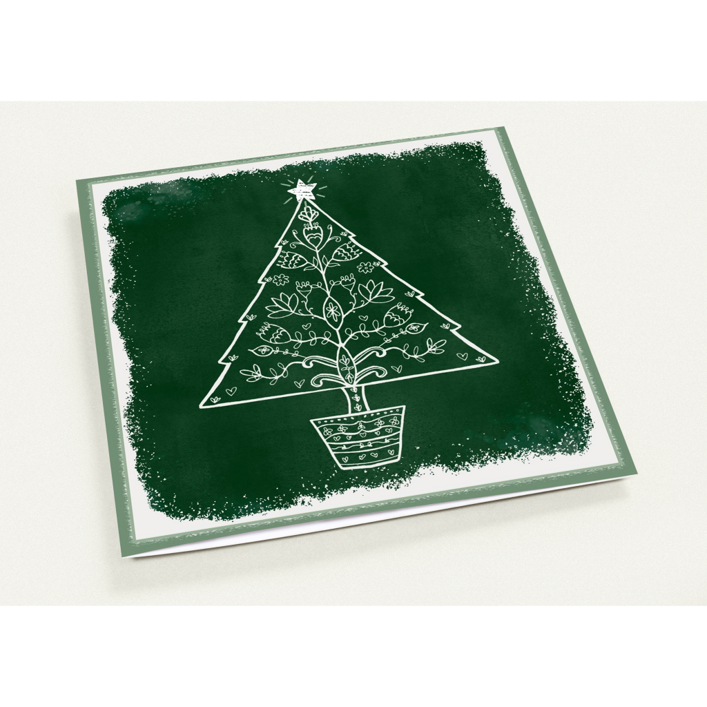 We did quite a few collaboration ones this year. When we worked on our colouring books, we both found that the collab images rose to the top as our favourites very quickly – my hand-drawn images and Naomi’s digital additions. And once again, we’ve discovered how much fun it is to bring our individual skills and styles to the same image. “Cute Christmas Baubles” is one of our collabs, for instance: I did the initial doodled design and Naomi coloured them. I then took her coloured versions, “cut them out” digitally, and did a variety of layouts. Or “Nordic Noel”: again, I did the initial drawing and Naomi did two great coloured versions for you and did the card layout. I had been working on a series of white-on-black ones for that scandi-style tree, but when I saw Naomi’s coloured versions, it was love at first sight, and I chucked out my designs immediately. (We did, however, keep one version that featured the hand-drawn outline. We put it on a rich dark-green background instead.)