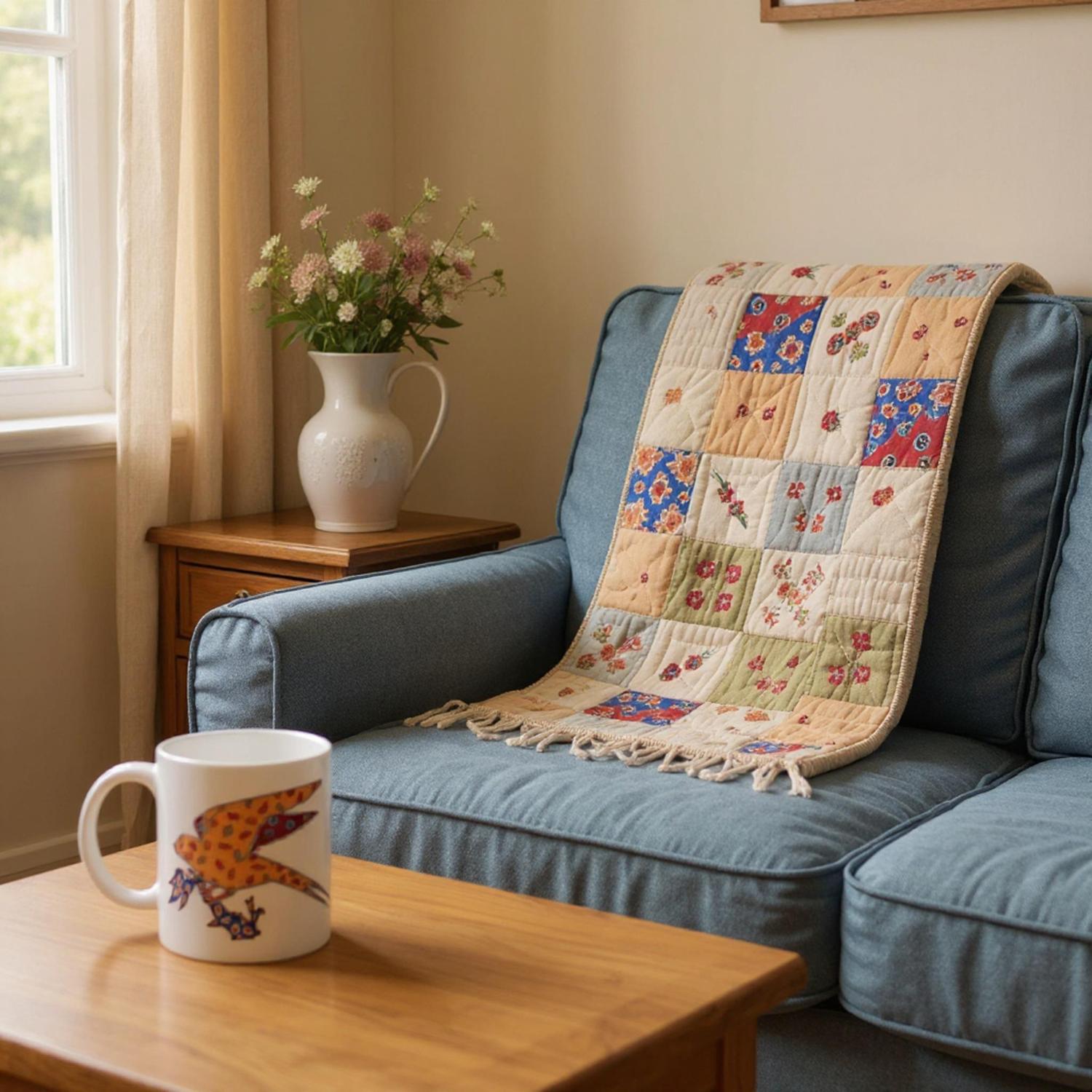“Patchwork Bird”, the original gouache artwork by Lisa, sits on both sides of the mug, in mirror reverse, so no matter if you’re a left-hander or a right-hander, you’ll be able to see the artwork smiling at you when you have your cuppa. (One of us is a left-hander and one of us is a right-hander, so we think about these things.)