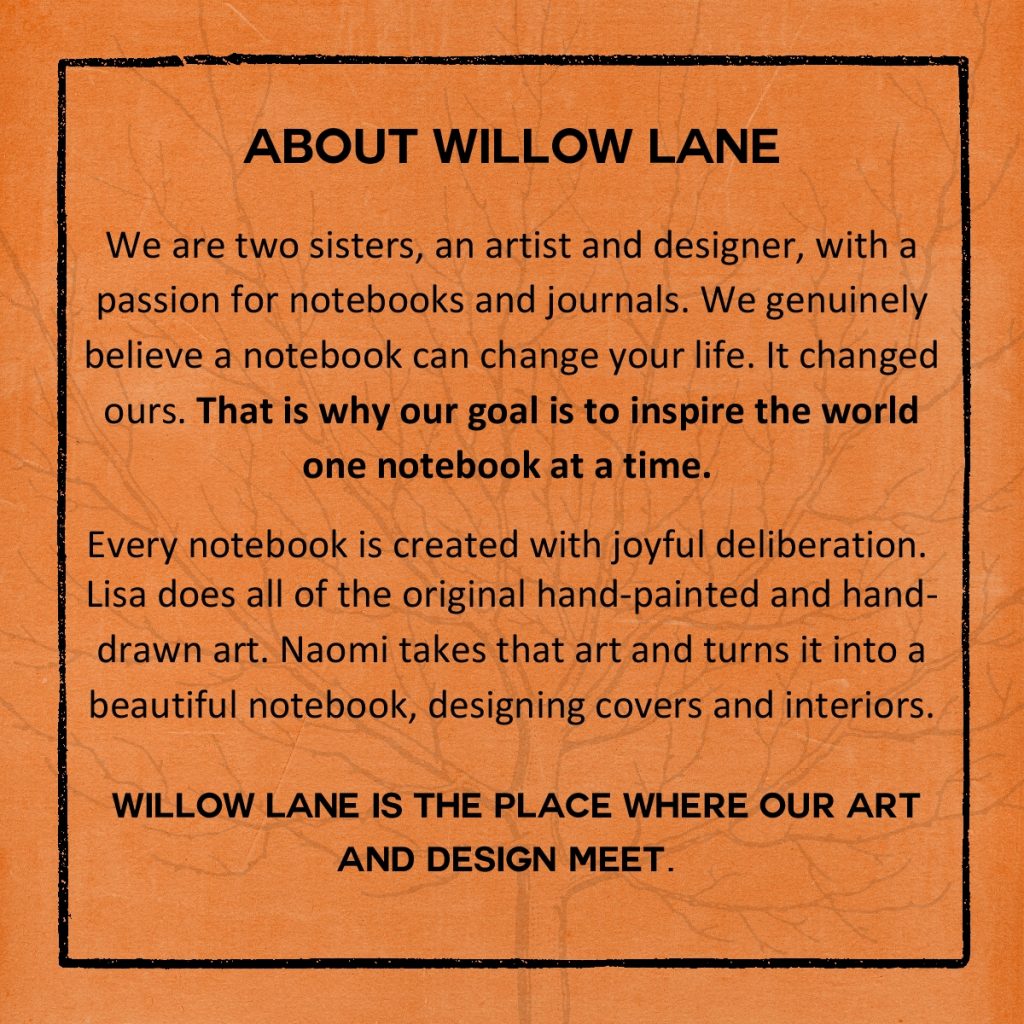 Every notebook is created with joyful deliberation. Lisa does all of the original hand-painted and hand-drawn art. Naomi takes that art and turns it into a beautiful notebook, designing covers and interiors. Willow Lane is the place where our art and design meet.