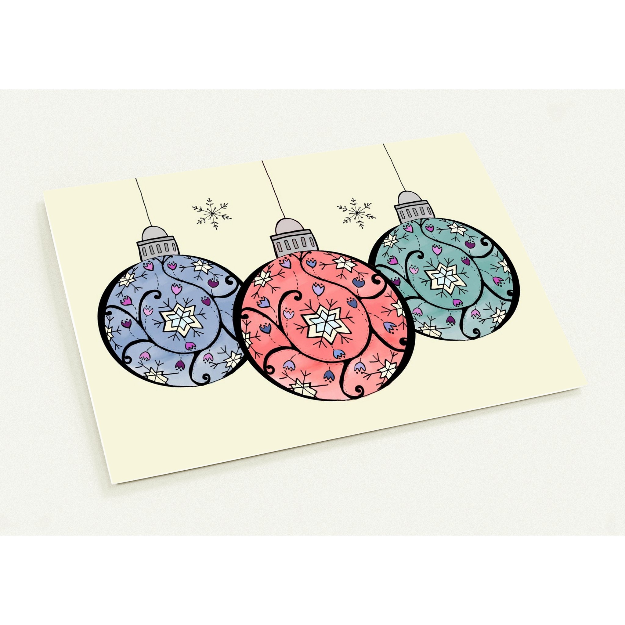 We love Christmas cards that are a bit different, both in styles and colours, and this is just the kind of thing we look for. Whimsical, cute and sweet, with colours that aren’t just red and green. These delightful Christmas baubles are a collaboration between us, from Lisa’s original doodle to Naomi’s colouring. And like most of our collaboration cards, this is one of our favourites.