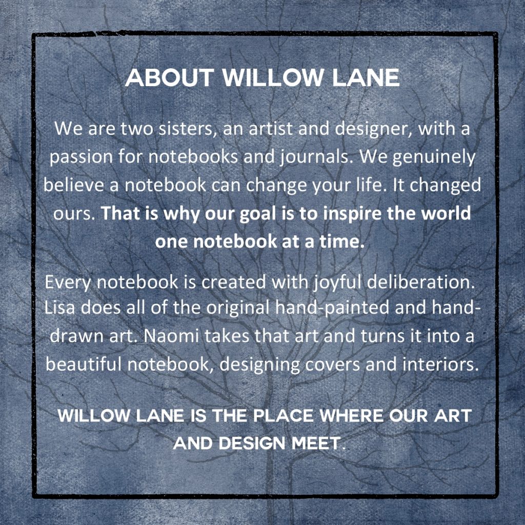 Every notebook is created with joyful deliberation. Lisa does all of the original hand-painted and hand-drawn art. Naomi takes that art and turns it into a beautiful notebook, designing covers and interiors. Willow Lane is the place where our art and design meet.