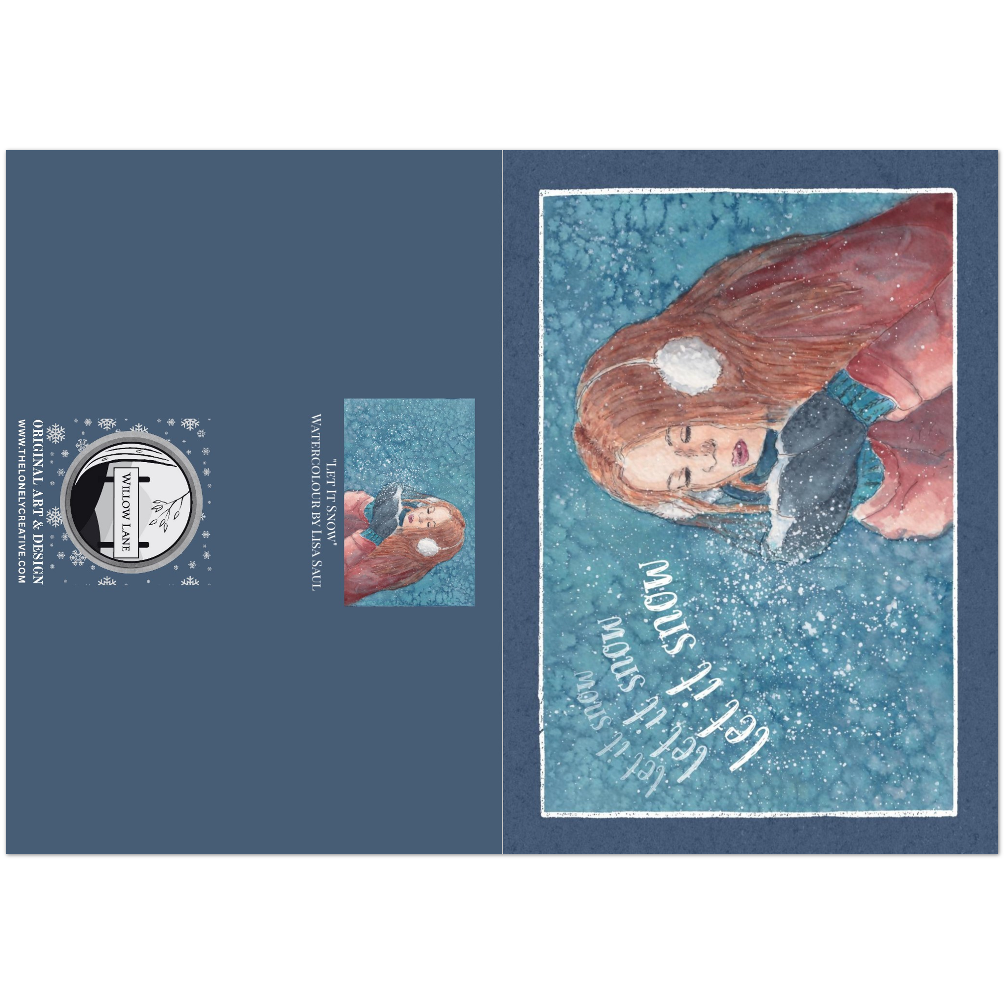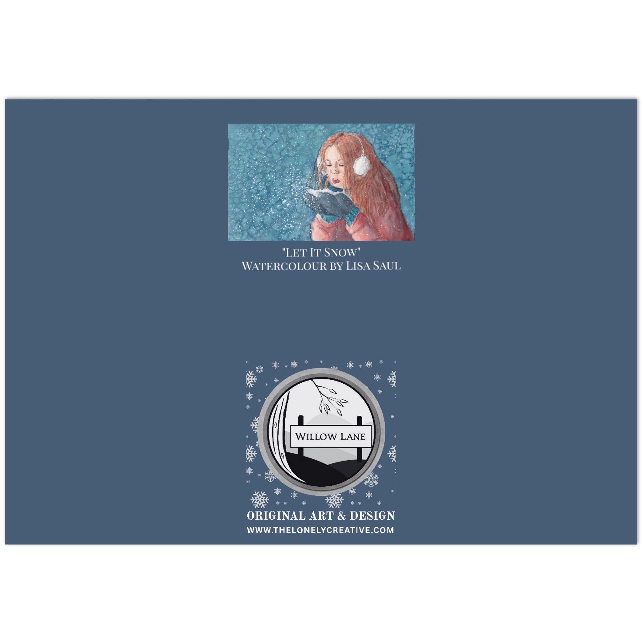 This artwork makes a great and unique Christmas card or just a card with a wintry theme. Inside we’ve carried the blue colour into a border around the two sides. (See the product photos for our example.) And on the back, the blue colour continues with a Christmas version of our Willow Lane Logo for that extra Christmassy feel.